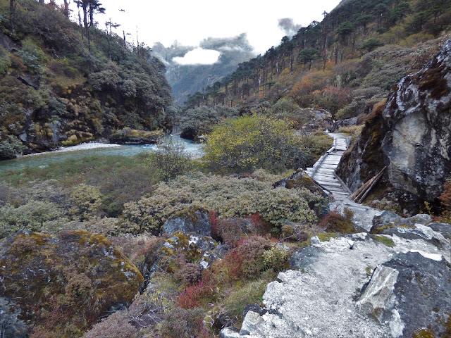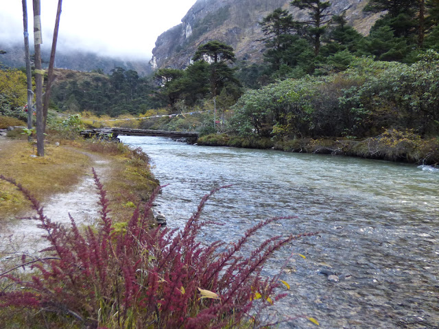 Šuchtám sa, čo noha nohu minie pozerajúc do diaľky, do nádherného rozprávkového údolia haliaceho sa do hmly smerom na Singeydzong. Už chápem, prečo si toto miesto vybral Padmasambava na meditovanie a jeho družka, tibetská princezná považovaná za ženského buddhu a reinkarnáciu Buddhovej matky Mayi – Khandro Yeshey Tshogyal (lady Kharchen) tu založila dzong. Singey dzong.