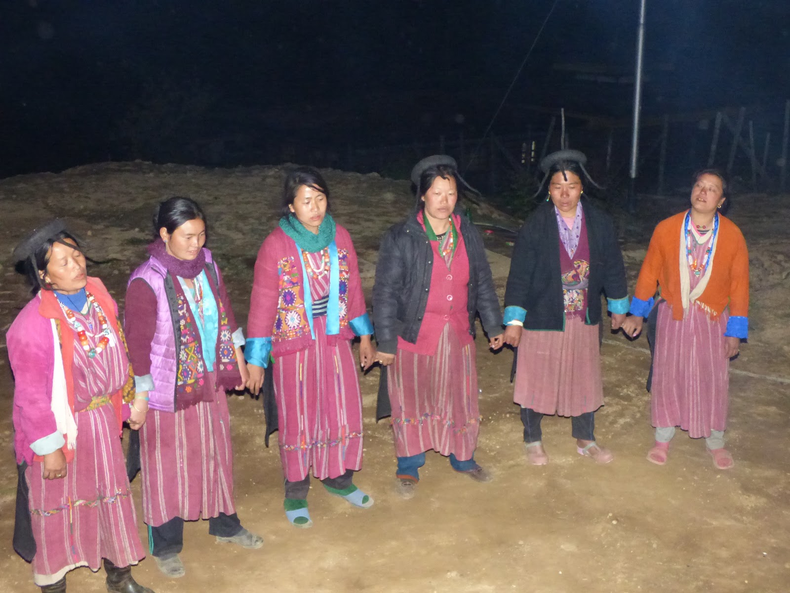 Ženy majú na hlavách klobúčiky z jačej srsti, ktorá je na hrane zmotaná do niekoľkých chvostíkov. Nakoniec sa k ich pomalému tancu pri ohni pridávame aj my a čo-to zaspievame.