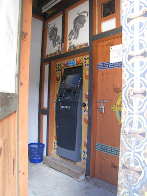 Civilizácia na parkovisku pred Lhuentse dzongom nás privíta krásnym kontrastom v podobe typického dreveno-kamenného, maľbami zdobeného domu, ktorý sa líši od ostatných iba tým, že na ňom visí tabuľa s nápisom „ATM Bank of Bhutan“. V predsieni tohoto domu je bankomat a stena okolo je zdobená kresbami potkana chrliaceho drahokami (ak si spomeniete, je to ten potkan, ktorého drží Ochranca Severu).